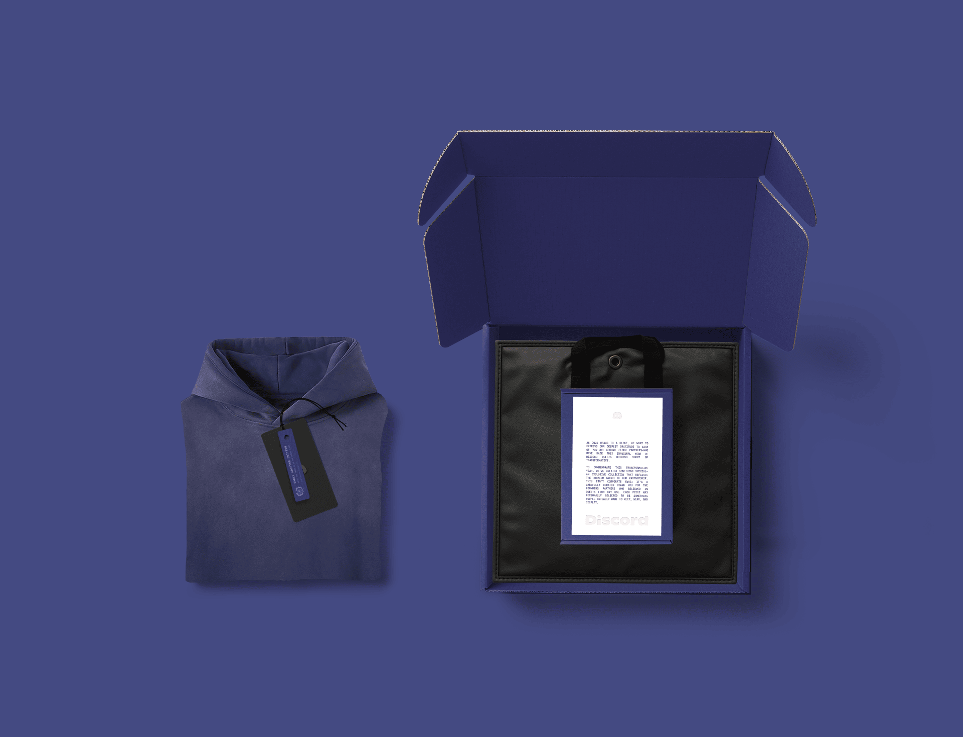 This year, I got the privilege of working with discord on one of their end of year gifting initiatives. Together, we created a high-end hoodie with custom tags and labels that helped highlight their achievements. The collection included a custom garment bag, paper tags, a letter, stickers and a limited edition playing card.